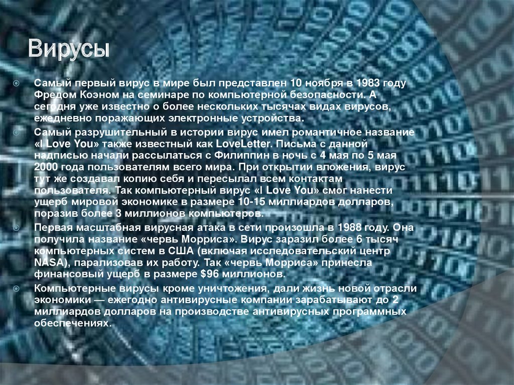 ВирусыСамый первый вирус в мире был представлен 10 ноября в 1983 году