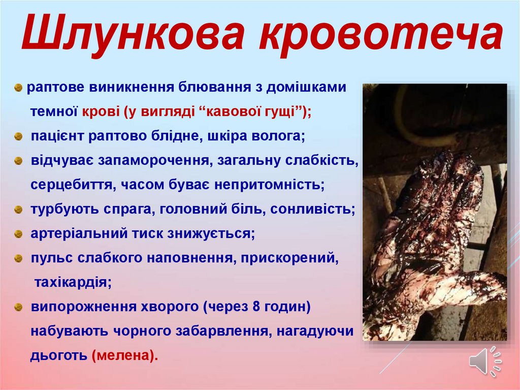 раптове виникнення блювання з домішкамитемної крові (у вигляді “кавової гущі”);