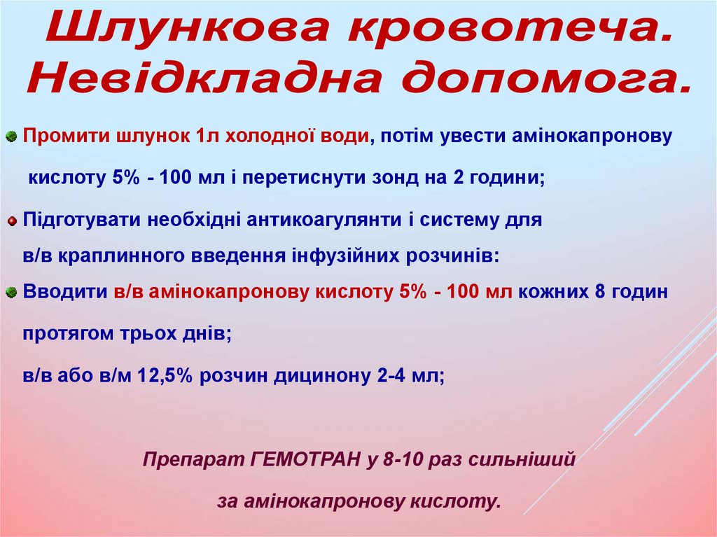 Промити шлунок 1л холодної води, потім увести амінокапроновукислоту 5% - 100 мл і перетиснути зонд на 2 години;