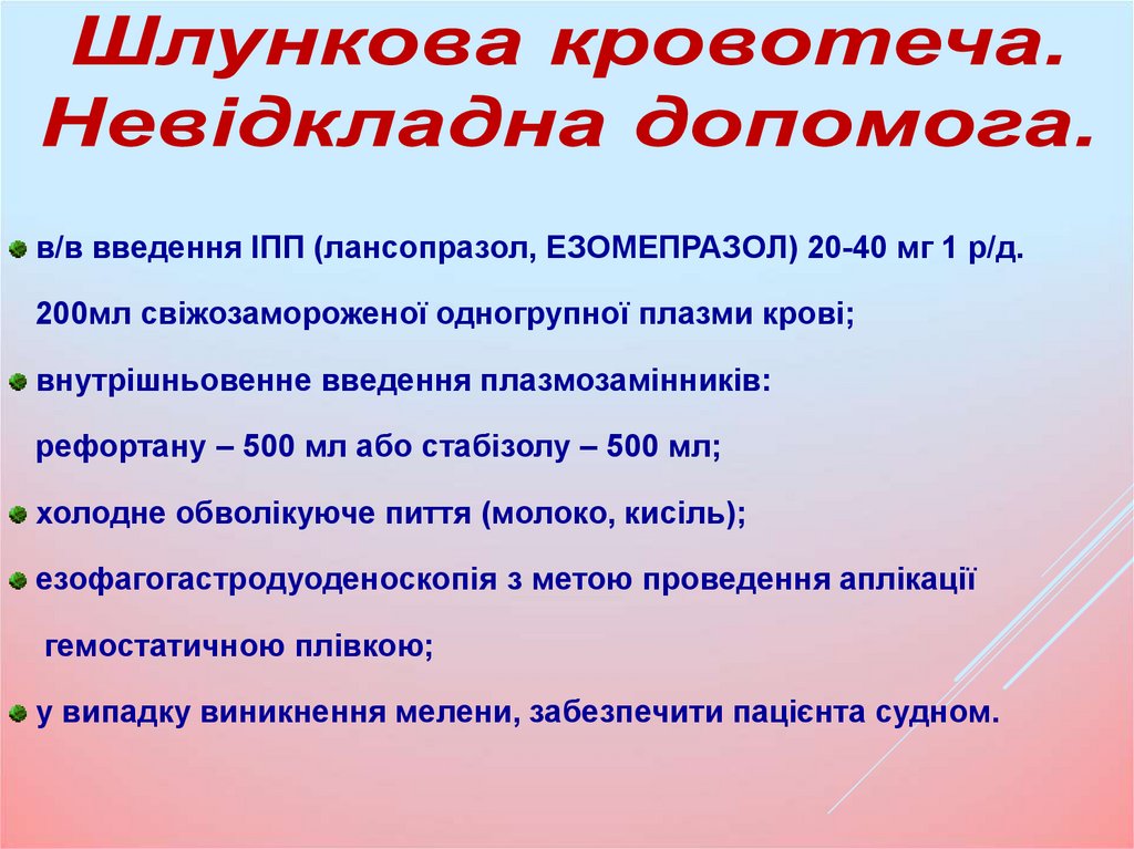 в/в введення ІПП (лансопразол, ЕЗОМЕПРАЗОЛ) 20-40 мг 1 р/д.200мл свіжозамороженої одногрупної плазми крові;
