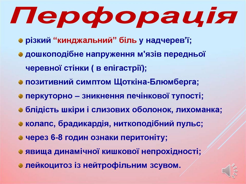 різкий “кинджальний” біль у надчерев’ї;дошкоподібне напруження м'язів передньої