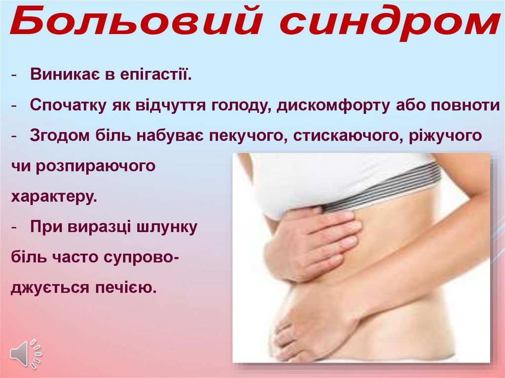 - Виникає в епігастії.- Спочатку як відчуття голоду, дискомфорту або повноти