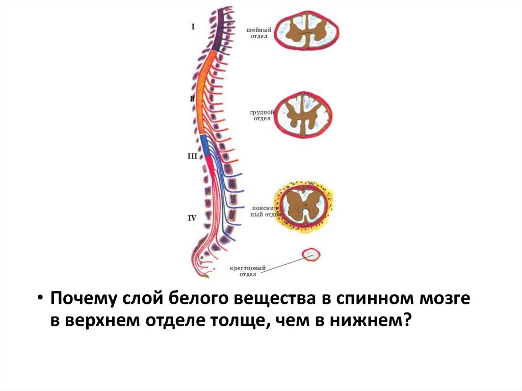 • Почему слой белого вещества в спинном мозгев верхнем отделе толще, чем в нижнем?