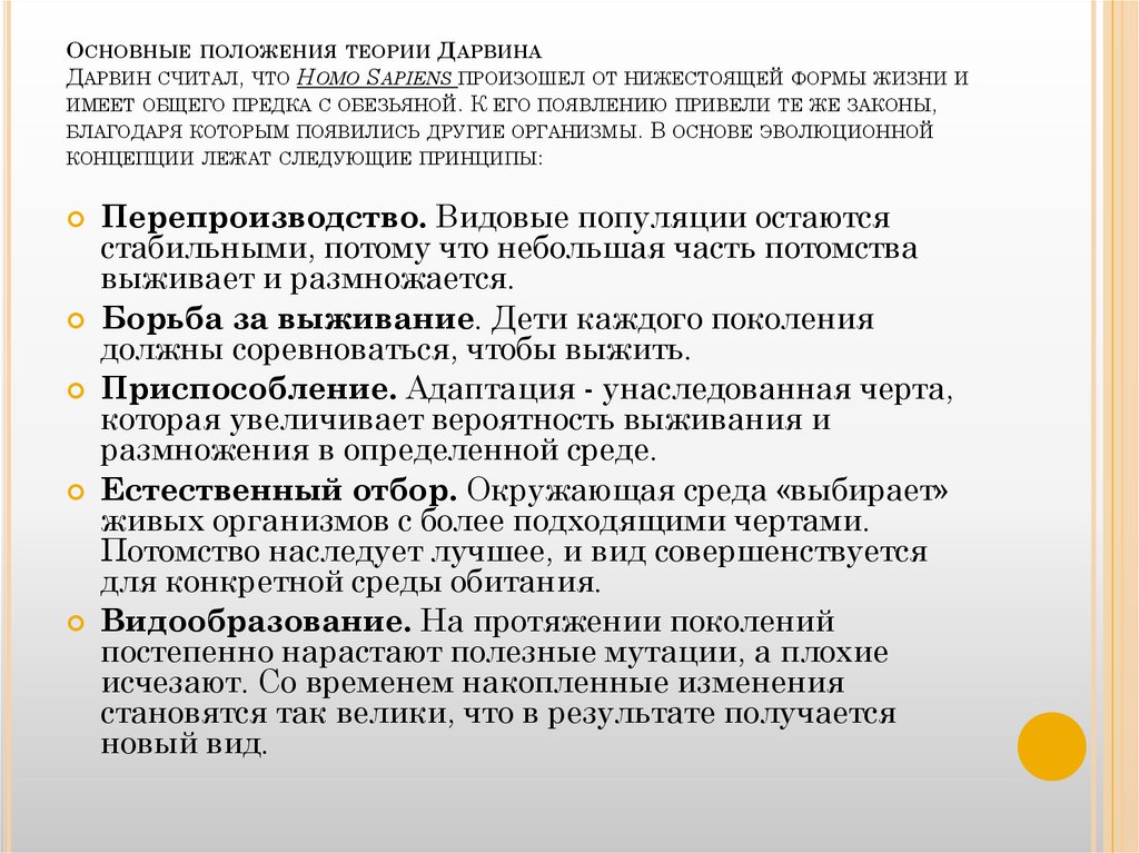 ОСНОВНЫЕ ПОЛОЖЕНИЯ ТЕОРИИ ДАРВИНАДАРВИН СЧИТАЛ, ЧТО HOMO SAPIENS ПРОИЗОШЕЛ ОТ НИЖЕСТОЯЩЕЙ ФОРМЫ ЖИЗНИ