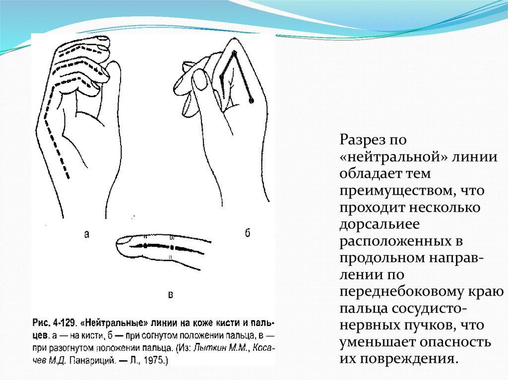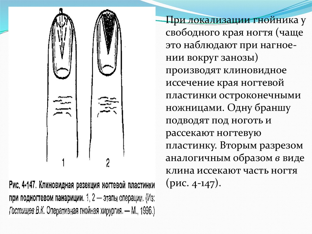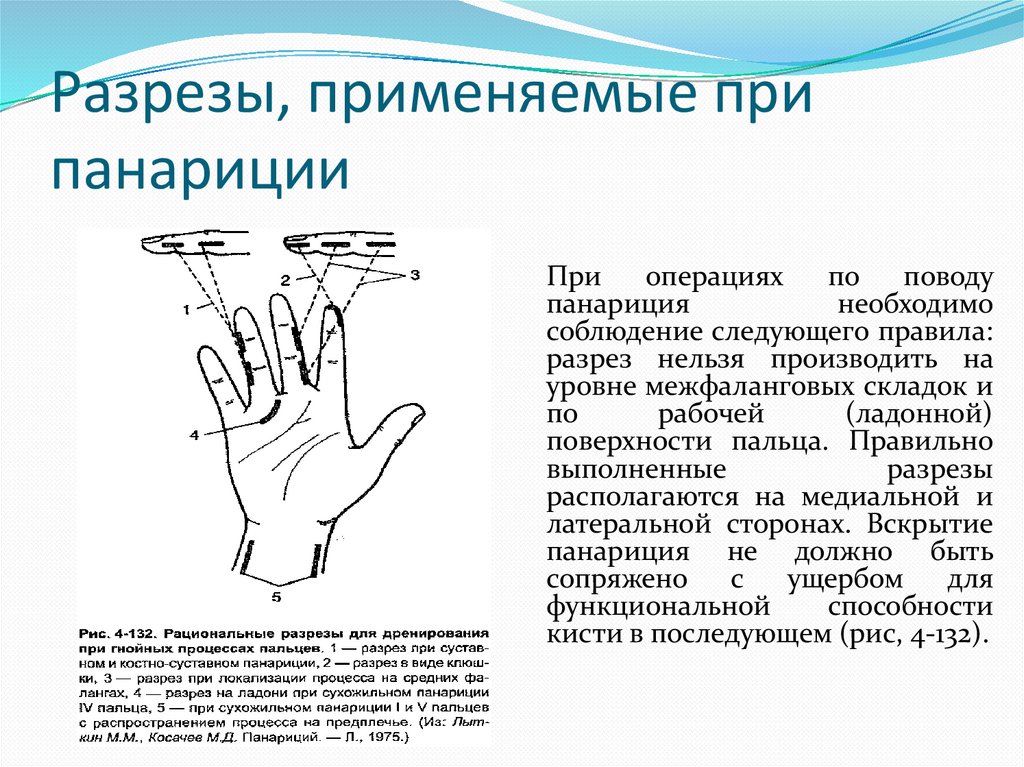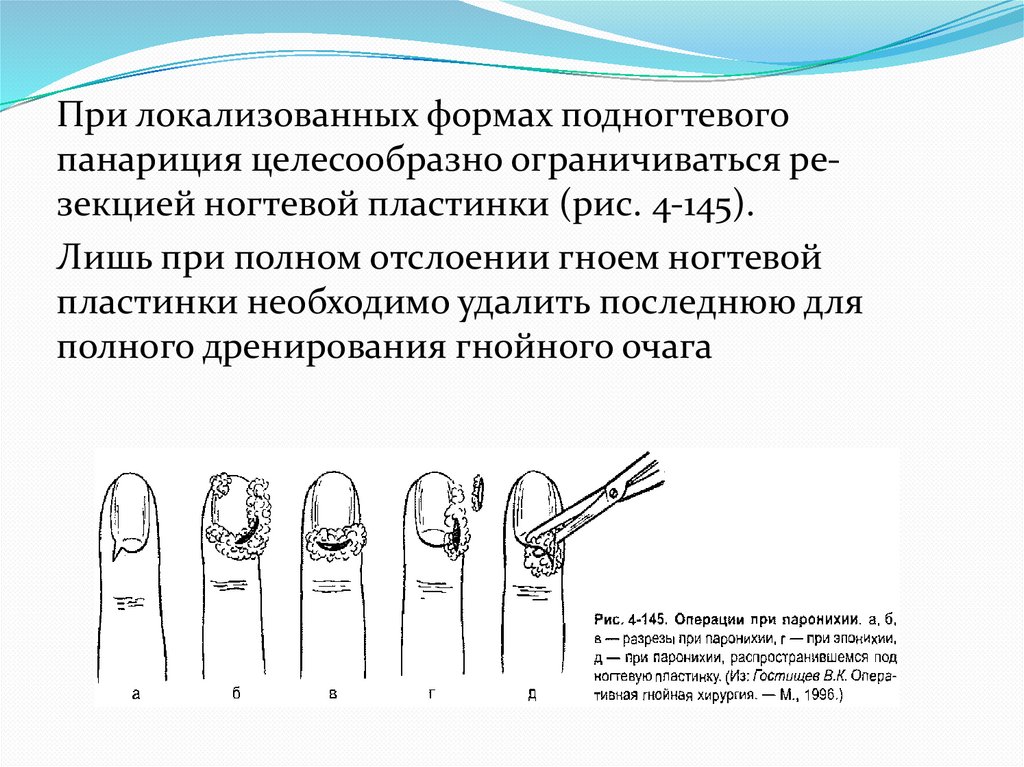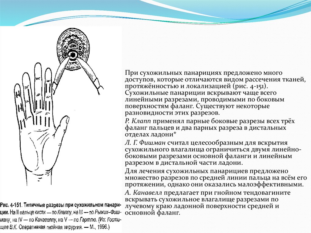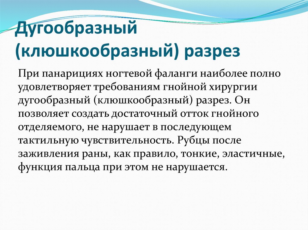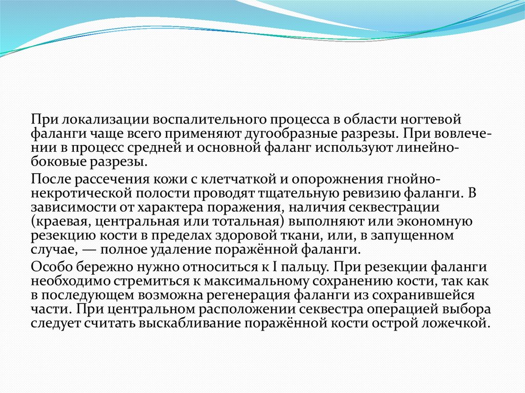 При локализации воспалительного процесса в области ногтевойфаланги чаще всего применяют дугообразные разрезы. При вовлечении в процесс средней и основной фаланг используют линейнобоковые разрезы.