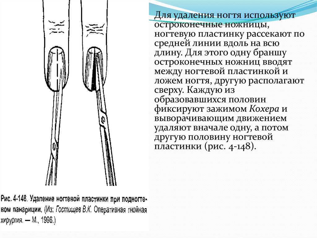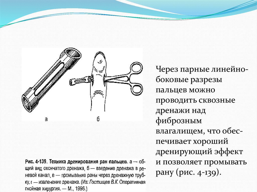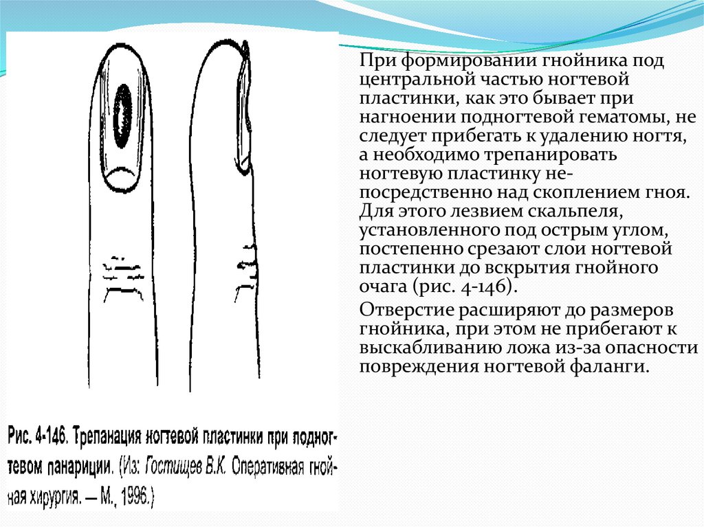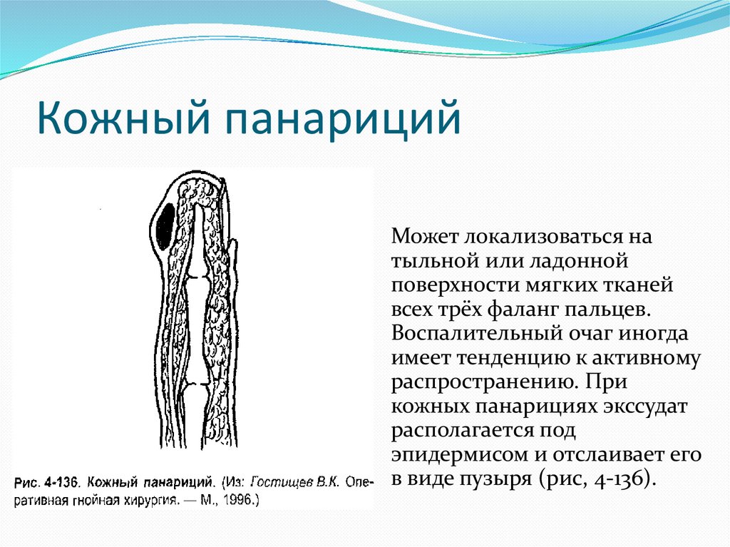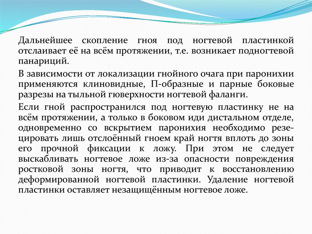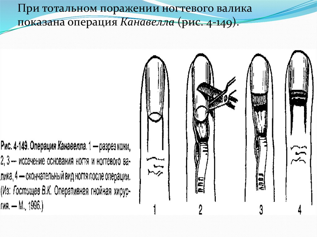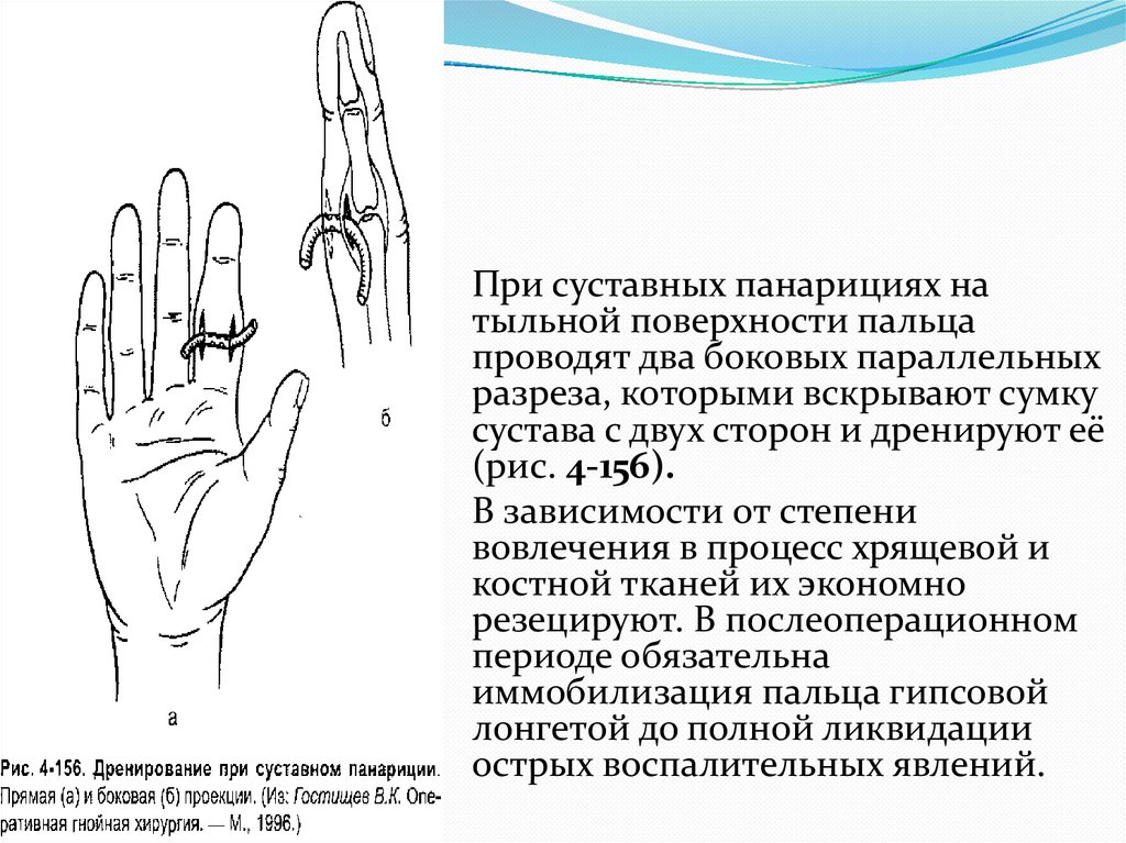 При локализации воспалительного процесса в области ногтевойфаланги чаще всего применяют дугообразные разрезы. При вовлечении в процесс средней и основной фаланг используют линейнобоковые разрезы.