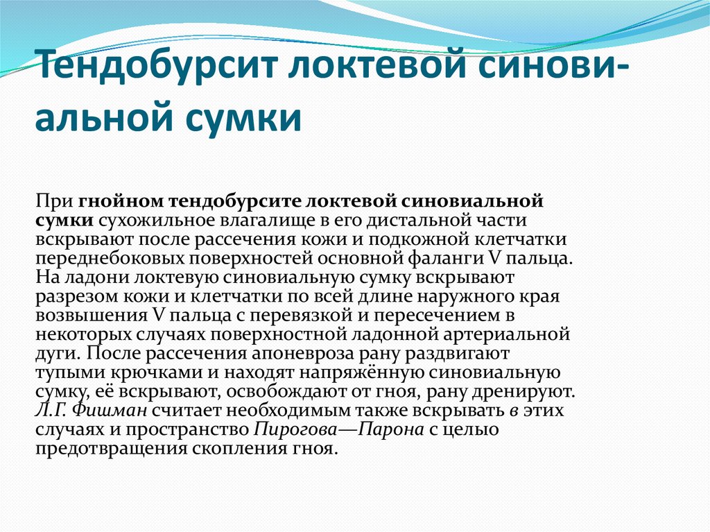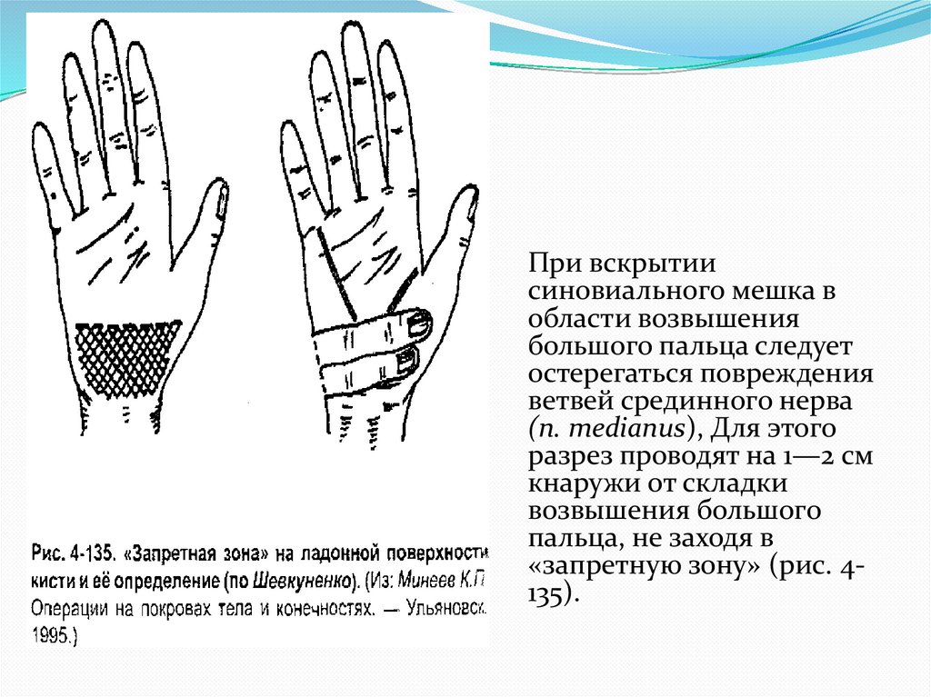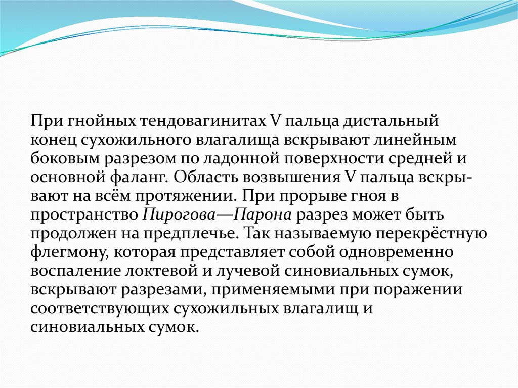 основной фаланг. Область возвышения V пальца вскрывают на всём протяжении. При прорыве гноя в