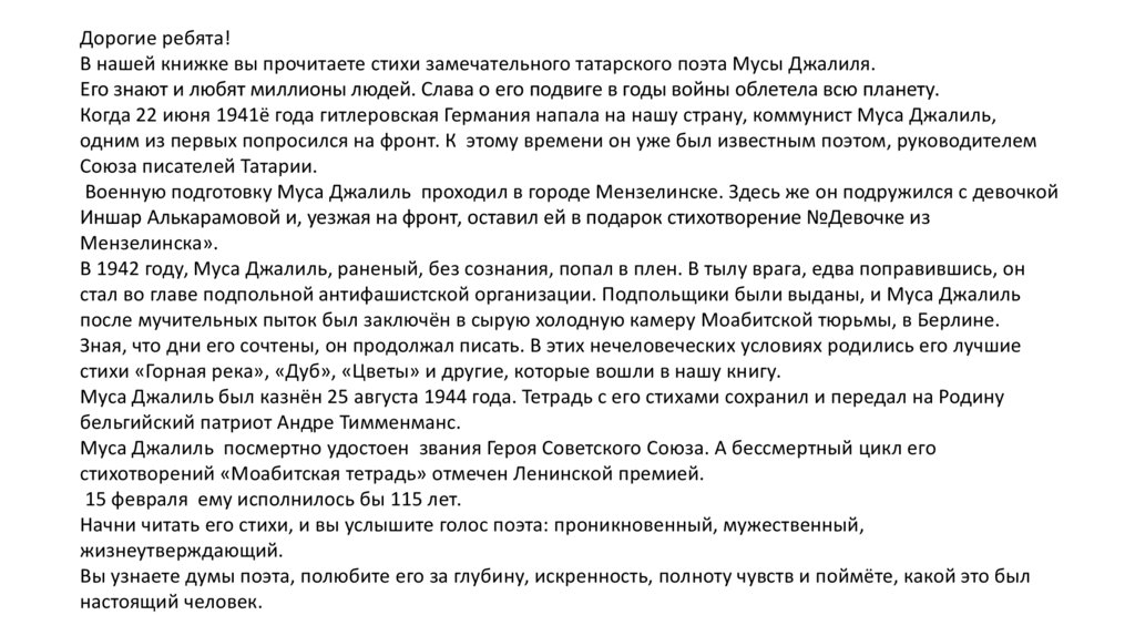 Дорогие ребята!В нашей книжке вы прочитаете стихи замечательного татарского поэта Мусы Джалиля.