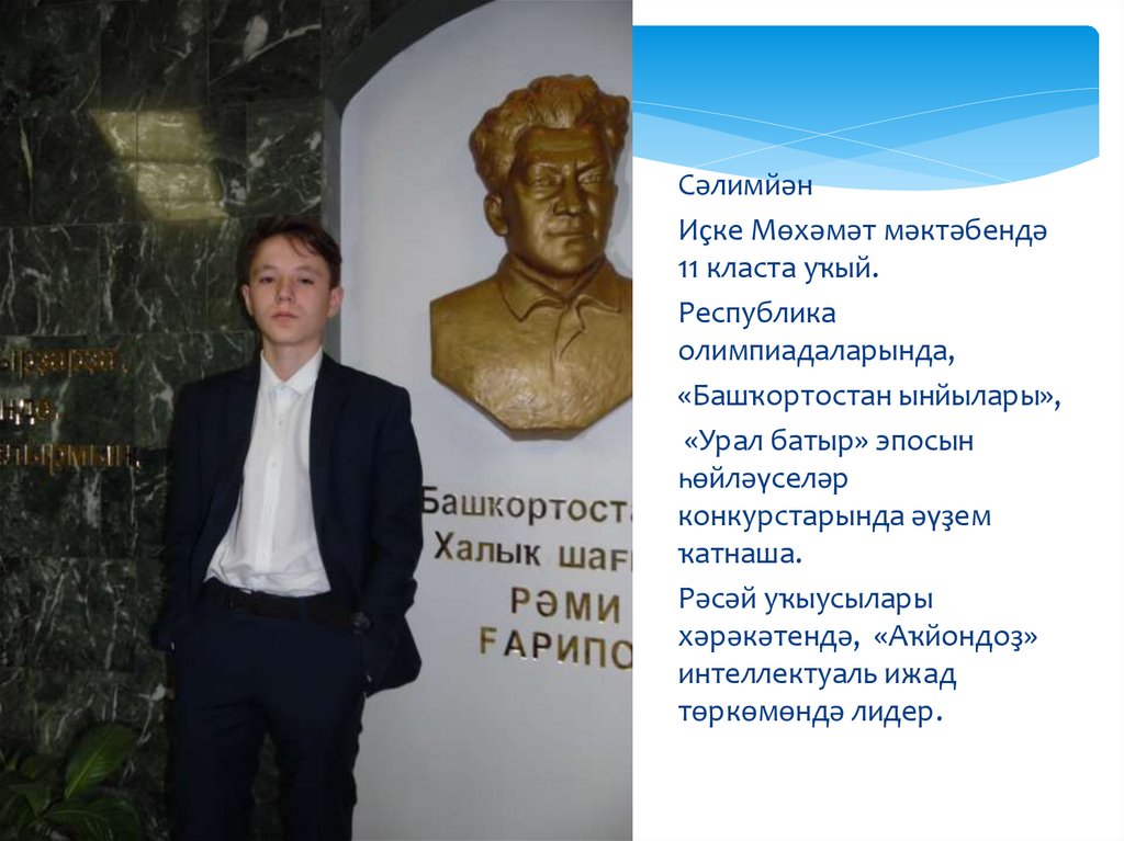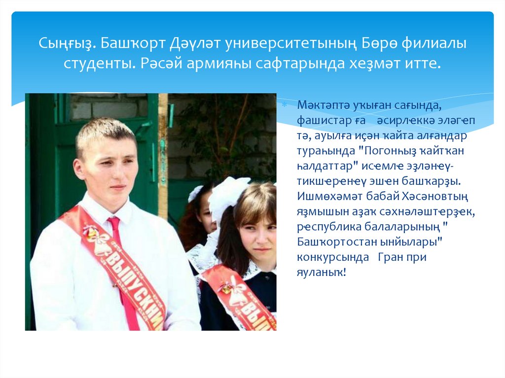 Сыңғыҙ. Башҡорт Дәүләт университетының Бөрө филиалыстуденты. Рәсәй армияһы сафтарында хеҙмәт итте.