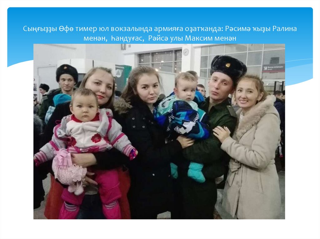 Сыңғыҙҙы Өфө тимер юл вокзалында армияға оҙатҡанда: Рәсимә ҡыҙы Ралинаменән, Һандуғас, Рәйсә улы Максим менән