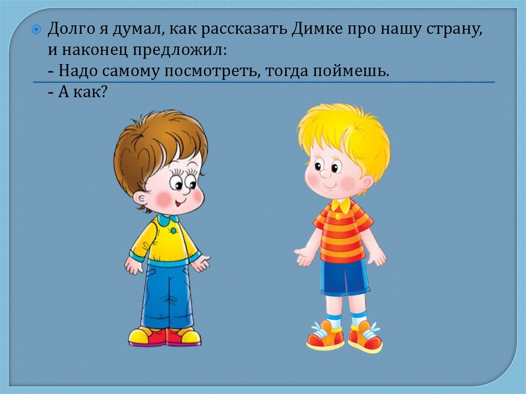 Долго я думал, как рассказать Димке про нашу страну,и наконец предложил: