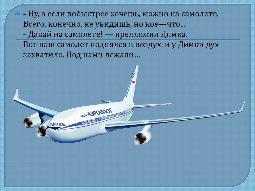 - Ну, а если побыстрее хочешь, можно на самолете.Всего, конечно, не увидишь, но кое—что...