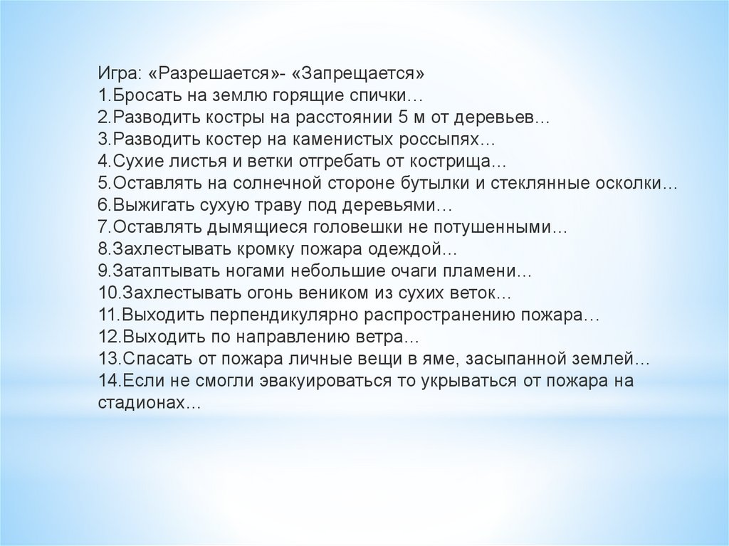 Игра: «Разрешается»- «Запрещается»1.Бросать на землю горящие спички…