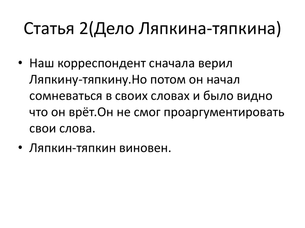Статья 2(Дело Ляпкина-тяпкина)• Наш корреспондент сначала верил