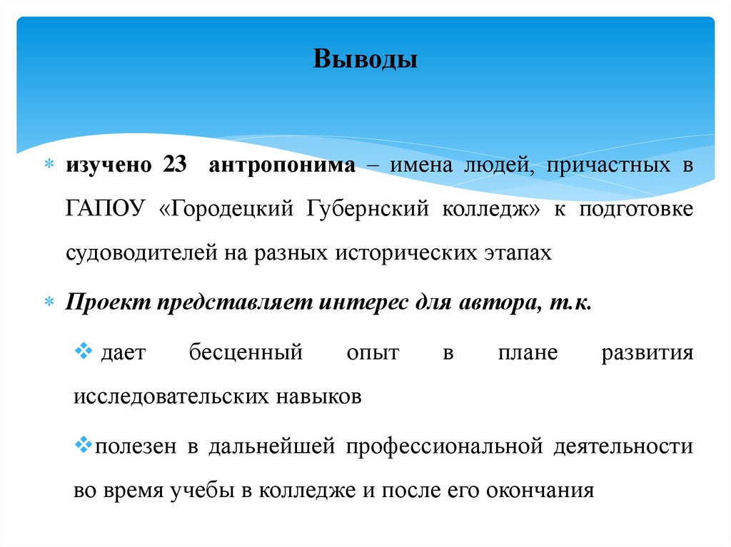 Выводыизучено 23 антропонима – имена людей, причастных в