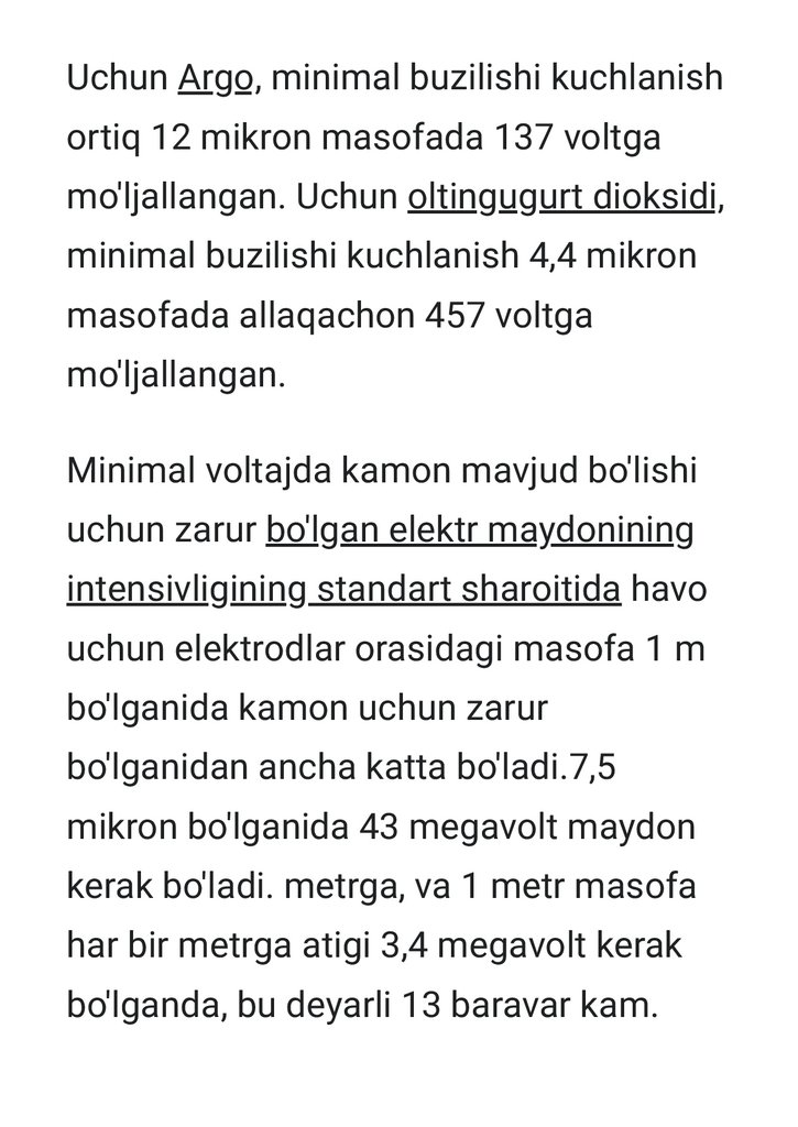 Uchun Argo, minimal buzilishi kuchlanishortiq 12 mikron masofada 137 voltga
