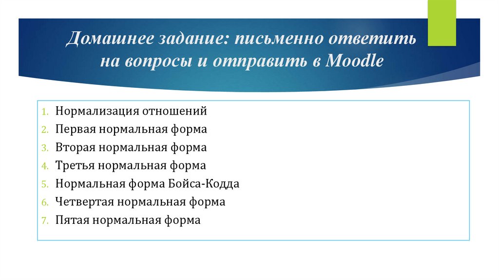 Домашнее задание: письменно ответитьна вопросы и отправить в Moodle