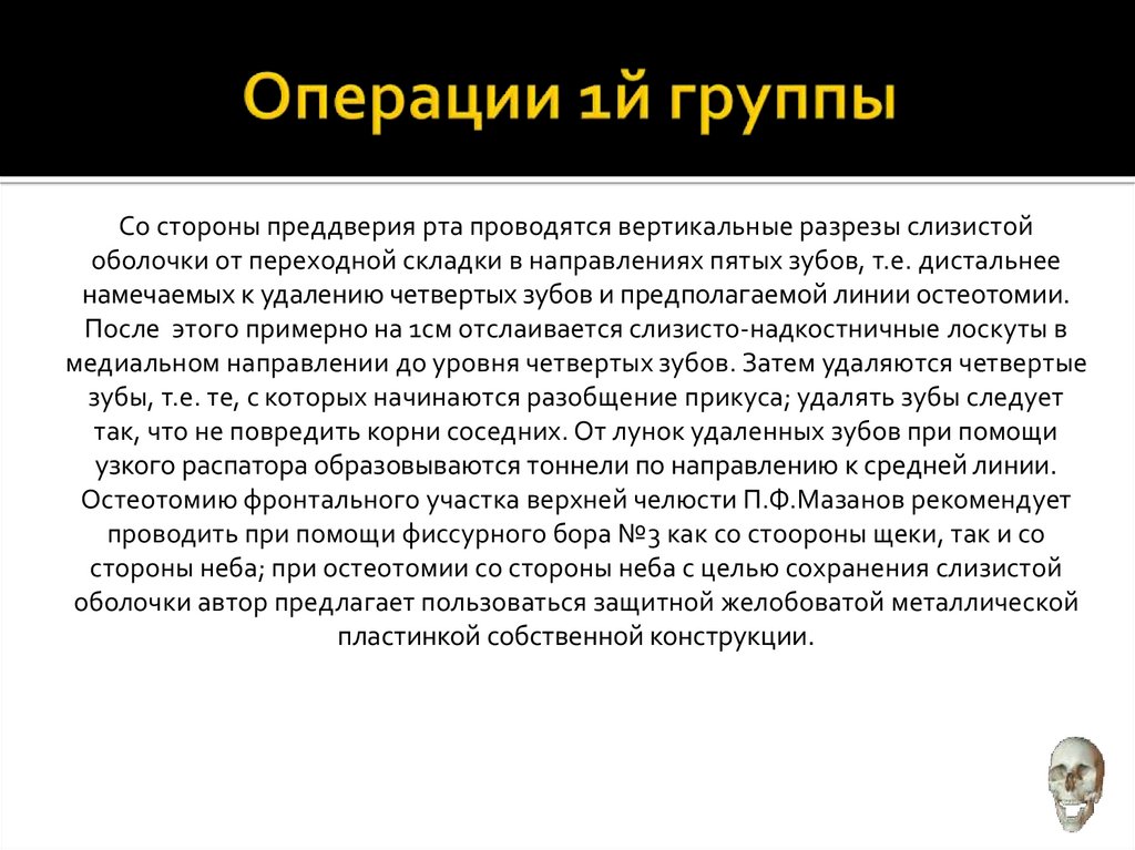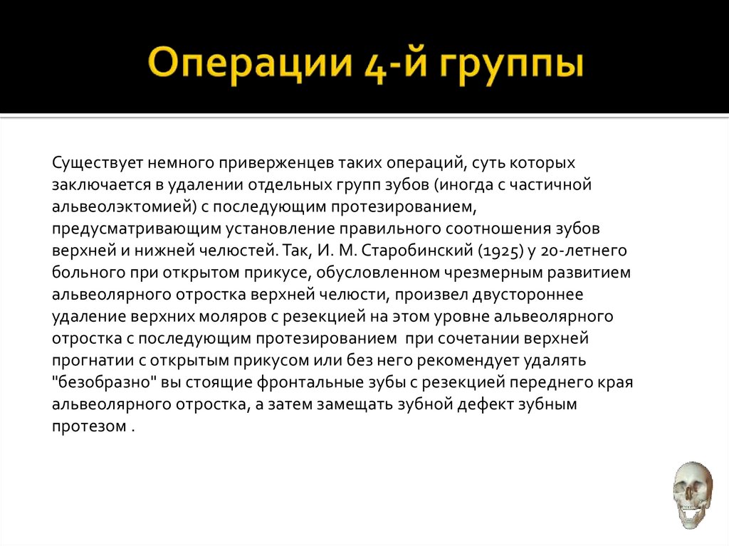 Существует немного приверженцев таких операций, суть которыхзаключается в удалении отдельных групп зубов (иногда с частичной
