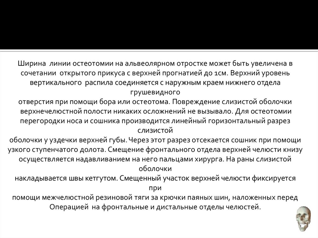Ширина линии остеотомии на альвеолярном отростке может быть увеличена всочетании открытого прикуса с верхней прогнатией до 1см. Верхний уровень