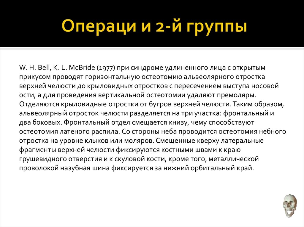W. Н. Bell, К. L. McBride (1977) при синдроме удлиненного лица с открытымприкусом проводят горизонтальную остеотомию альвеолярного отростка
