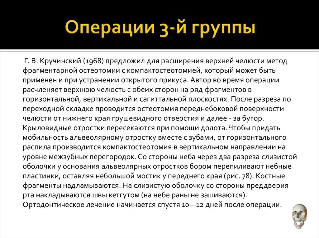 Г. В. Кручинский (1968) предложил для расширения верхней челюсти методфрагментарной остеотомии с компактостеотомией, который может быть