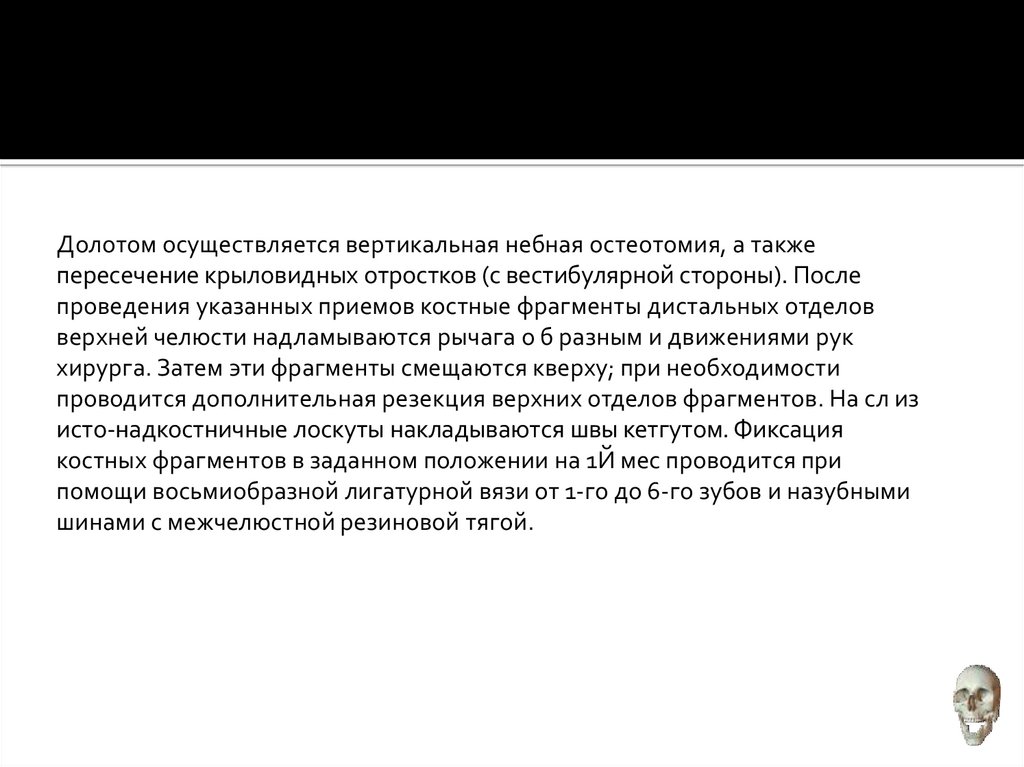 Долотом осуществляется вертикальная небная остеотомия, а такжепересечение крыловидных отростков (с вестибулярной стороны). После