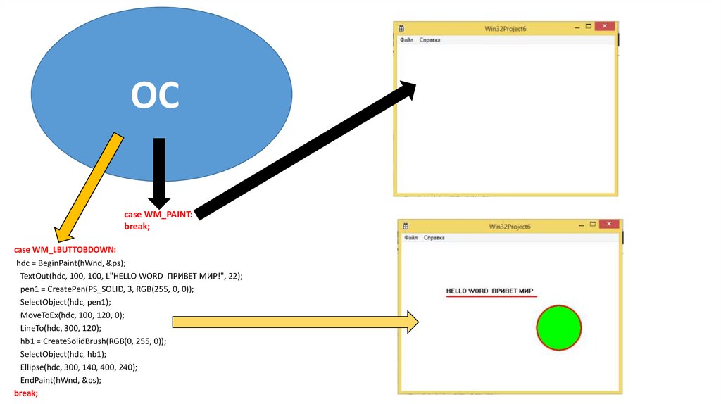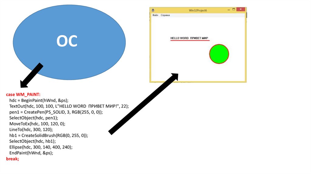 TextOut(hdc, 100, 100, L"HELLO WORD ПРИВЕТ МИР!", 22);
