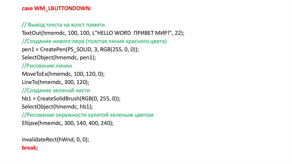 case WM_LBUTTONDOWN:// Вывод текста на холст памяти