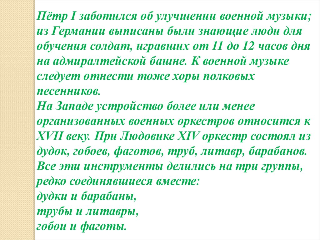 Пётр I заботился об улучшении военной музыки;из Германии выписаны были знающие люди для