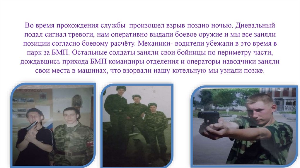 Во время прохождения службы произошел взрыв поздно ночью. Дневальныйподал сигнал тревоги, нам оперативно выдали боевое оружие и мы все заняли