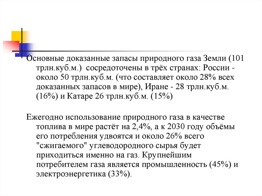 Основные доказанные запасы природного газа Земли (101трлн.куб.м.) сосредоточены в трёх странах: России около 50 трлн.куб.м. (что составляет около 28% всех