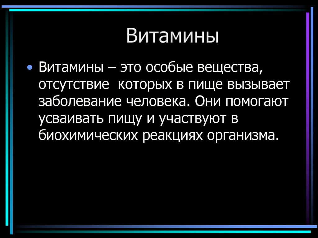 • Витамины – это особые вещества,отсутствие которых в пище вызывает