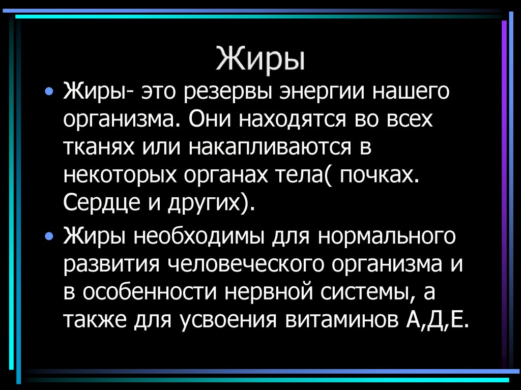 • Жиры- это резервы энергии нашегоорганизма. Они находятся во всех
