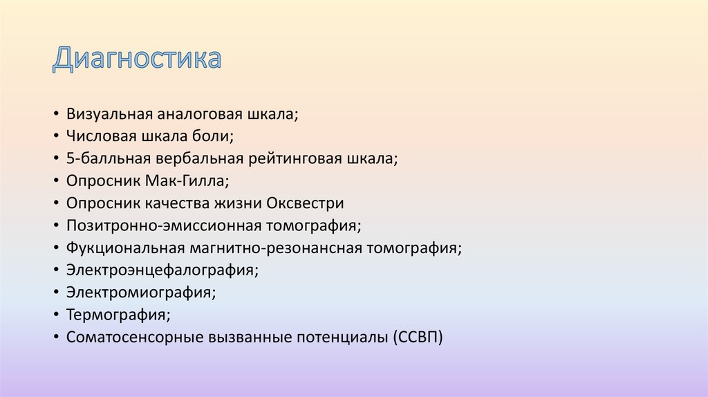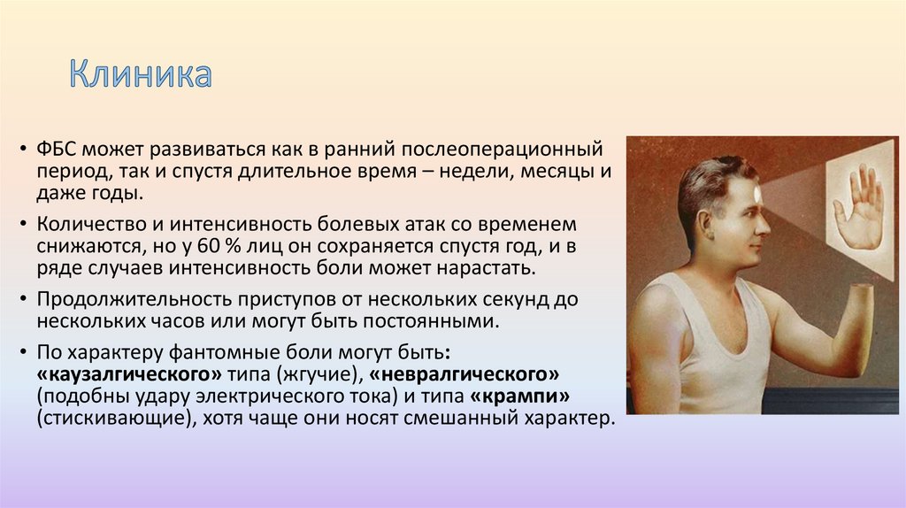 По характеру фантомную боль подразделяют на четыре основные группы:• боль по типу невралгических болей (описывается пациентами как
