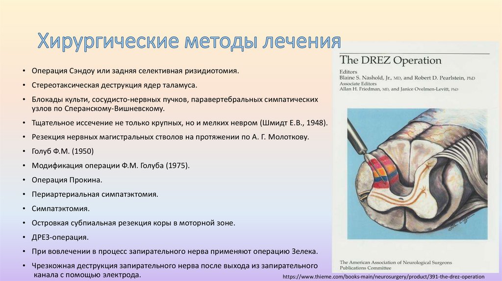 • Операция Сэндоу или задняя селективная ризидиотомия.• Стереотаксическая деструкция ядер таламуса.