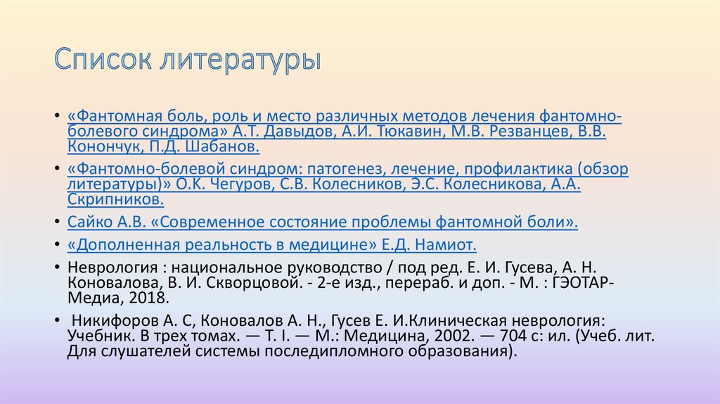 • «Фантомная боль, роль и место различных методов лечения фантомноболевого синдрома» А.Т. Давыдов, А.И. Тюкавин, М.В. Резванцев, В.В.Конончук, П.Д. Шабанов.
