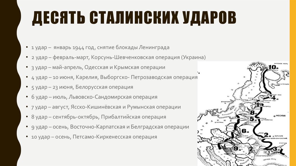 ДЕСЯТЬ СТАЛИНСКИХ УДАРОВ• 1 удар – январь 1944 год, снятие блокады Ленинграда