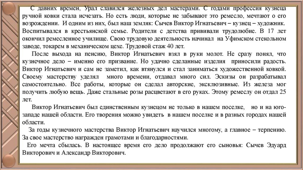 возрождении. И одним из них, был наш земляк: Сычев Виктор Игнатьевич – кузнец – художник.