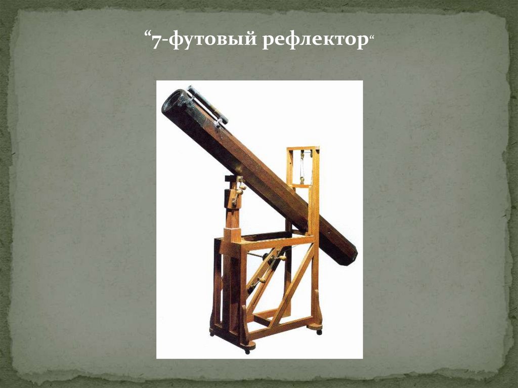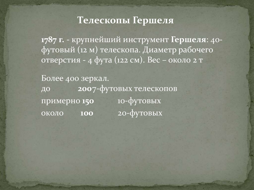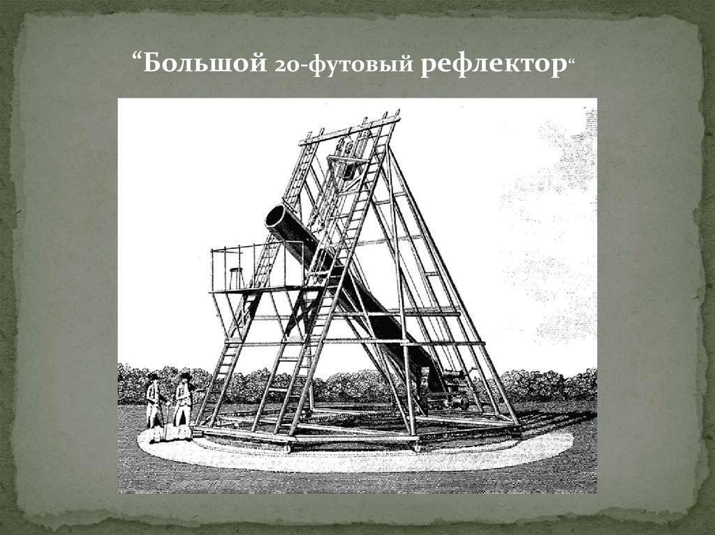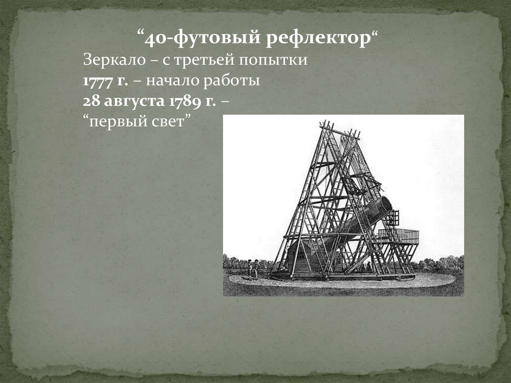 Телескопы Гершеля1787 г. - крупнейший инструмент Гершеля: 40футовый (12 м) телескопа. Диаметр рабочего
