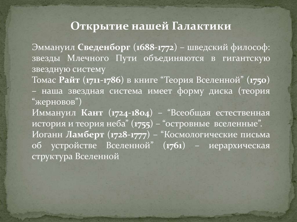 Открытие нашей ГалактикиЭммануил Сведенборг (1688-1772) – шведский философ: