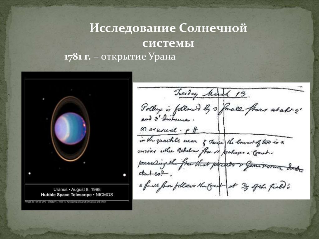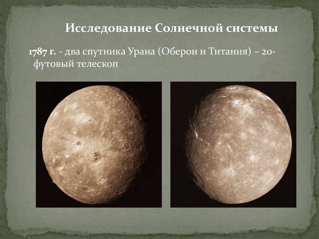 Исследование Солнечной системы1787 г. - два спутника Урана (Оберон и Титания) – 20футовый телескоп