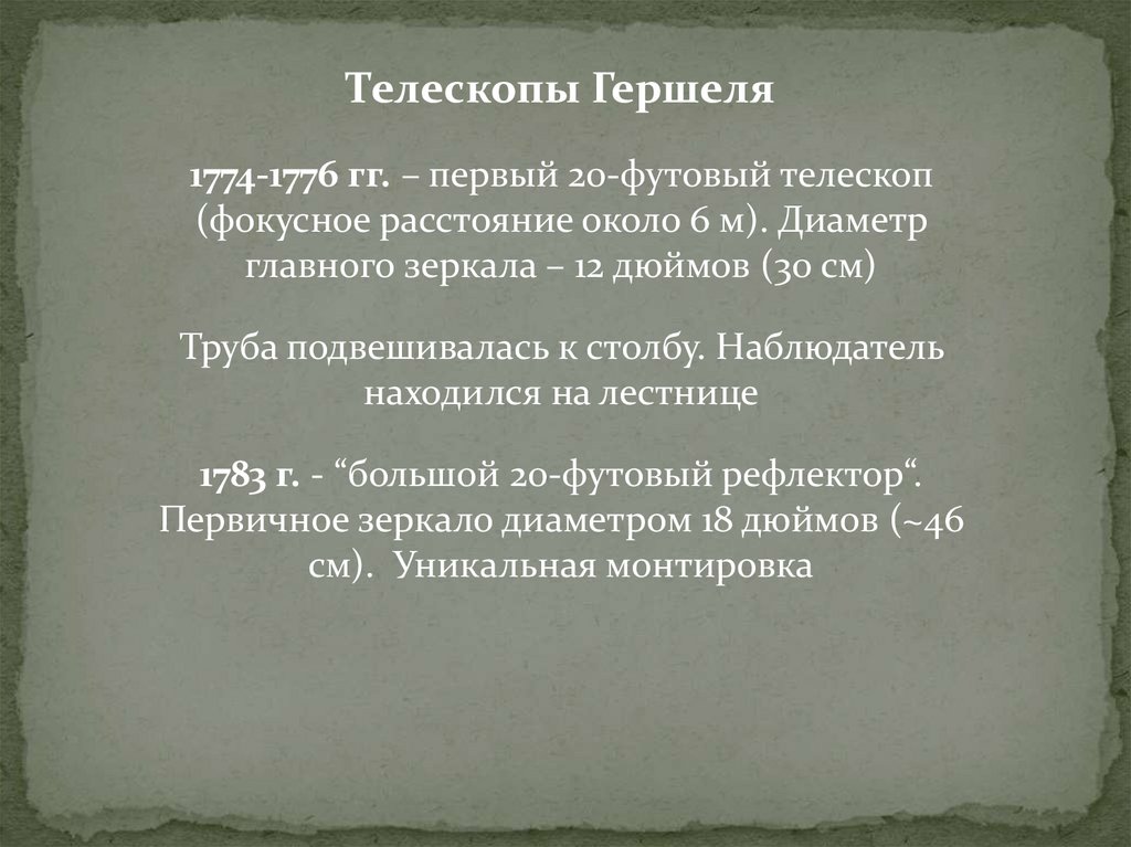 Телескопы Гершеля1774-1776 гг. – первый 20-футовый телескоп