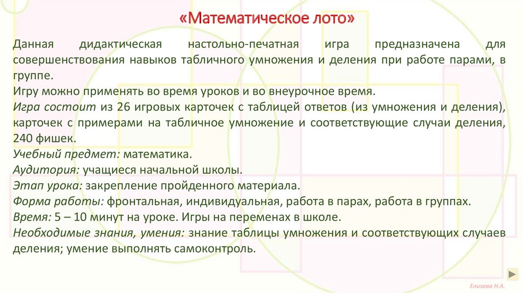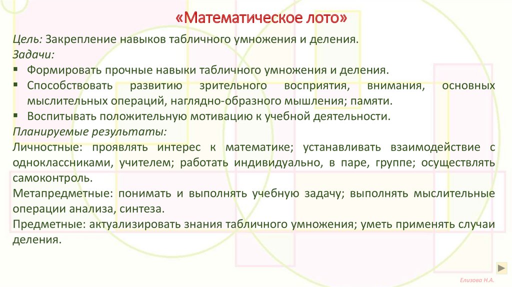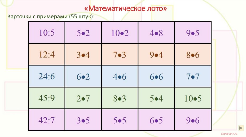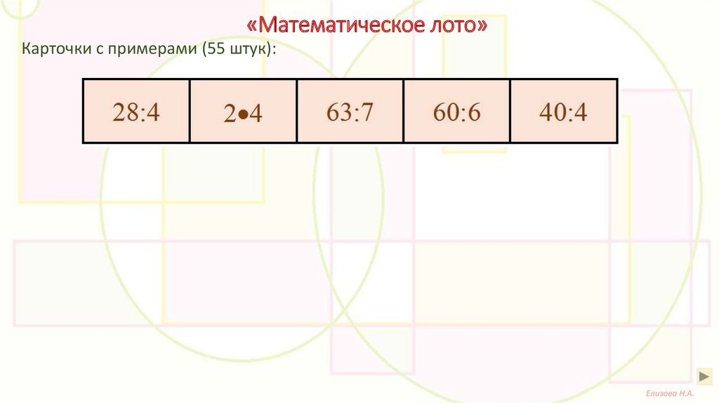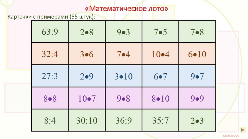 «Математическое лото»Цель: Закрепление навыков табличного умножения и деления.