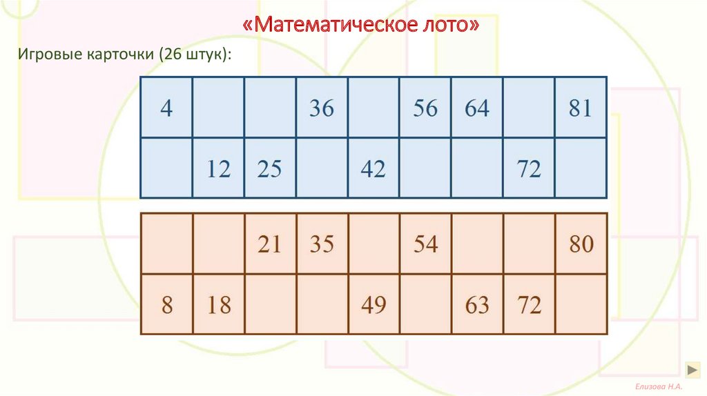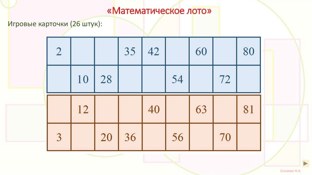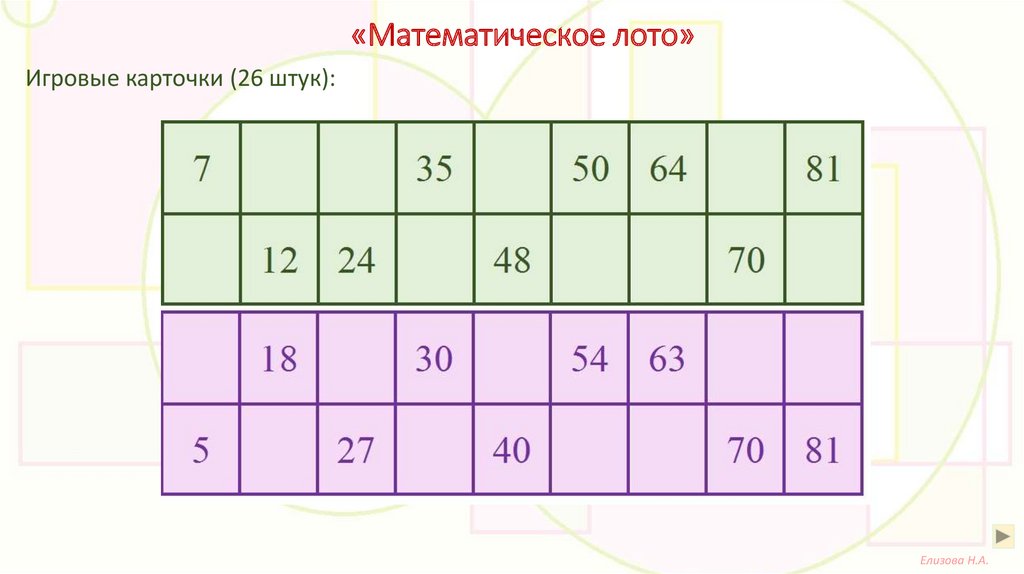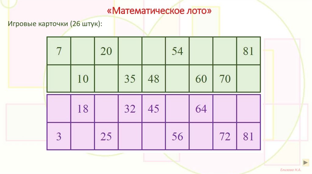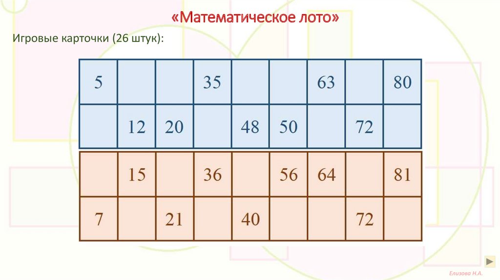 «Математическое лото»Игровые карточки (26 штук):