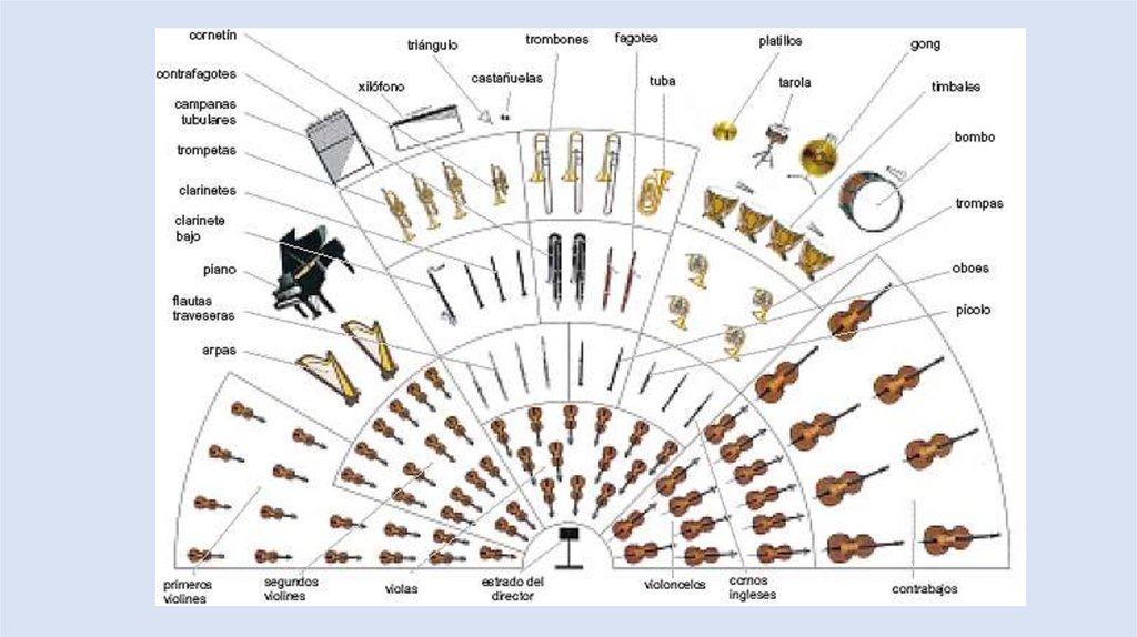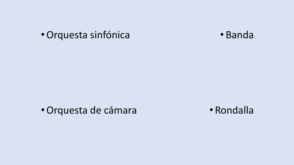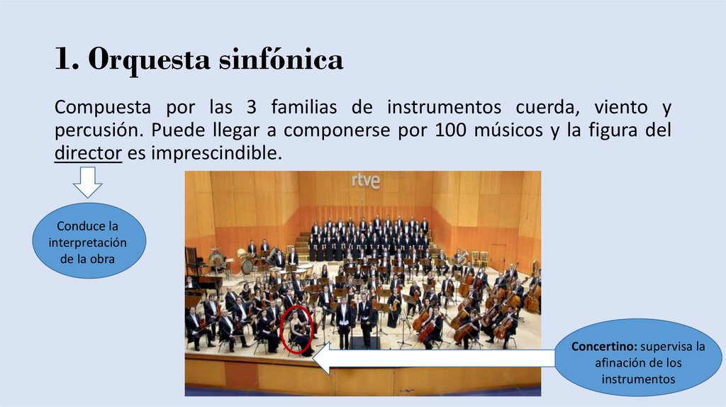 1. Orquesta sinfónicaCompuesta por las 3 familias de instrumentos cuerda, viento y