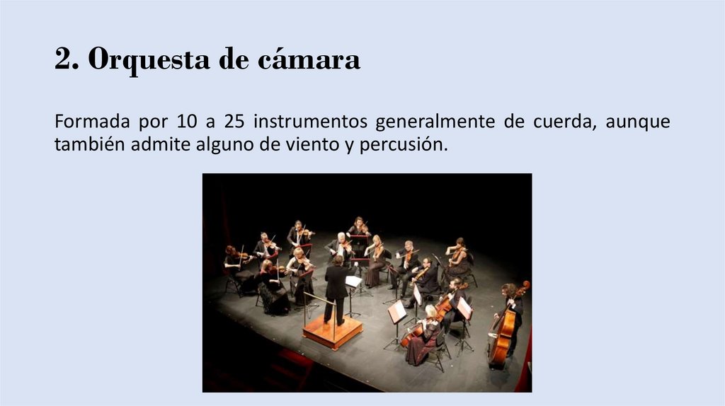 2. Orquesta de cámaraFormada por 10 a 25 instrumentos generalmente de cuerda, aunque