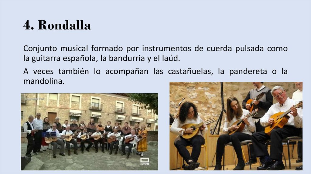 4. RondallaConjunto musical formado por instrumentos de cuerda pulsada como