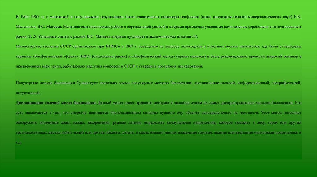 Географический метод биолокации Данный метод появился относительно недавно. Его суть заключается в том, что биолокатор работает не на