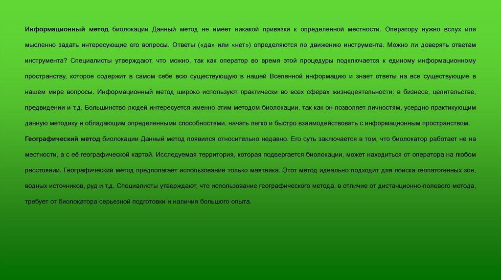 Информационный метод биолокации Данный метод не имеет никакой привязки к определенной местности. Оператору нужно вслух илимысленно задать интересующие его вопросы. Ответы («да» или «нет») определяются по движению инструмента. Можно ли доверять ответам