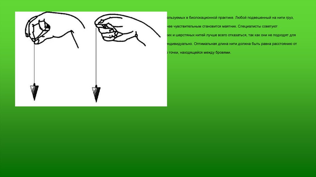 Маятник Маятник – один из самых эффективных и распространенных инструментов, используемых в биолокационной практике. Любой подвешенный на нити груз,имеющий вес от 15 г до 30 г, можно использовать как маятник. Чем тяжелее груз, тем менее чувствительным становится маятник. Специалисты советуют